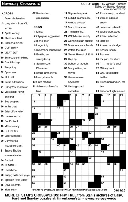Because free access to the content of Newsday.com is available only to Newsday subscribers and customers of Cablevision (Newsday’s owner), many thousands of puzzle fans, spanning six continents, get the Newsday Crossword free every day right here at Stan’s Crossword Land.